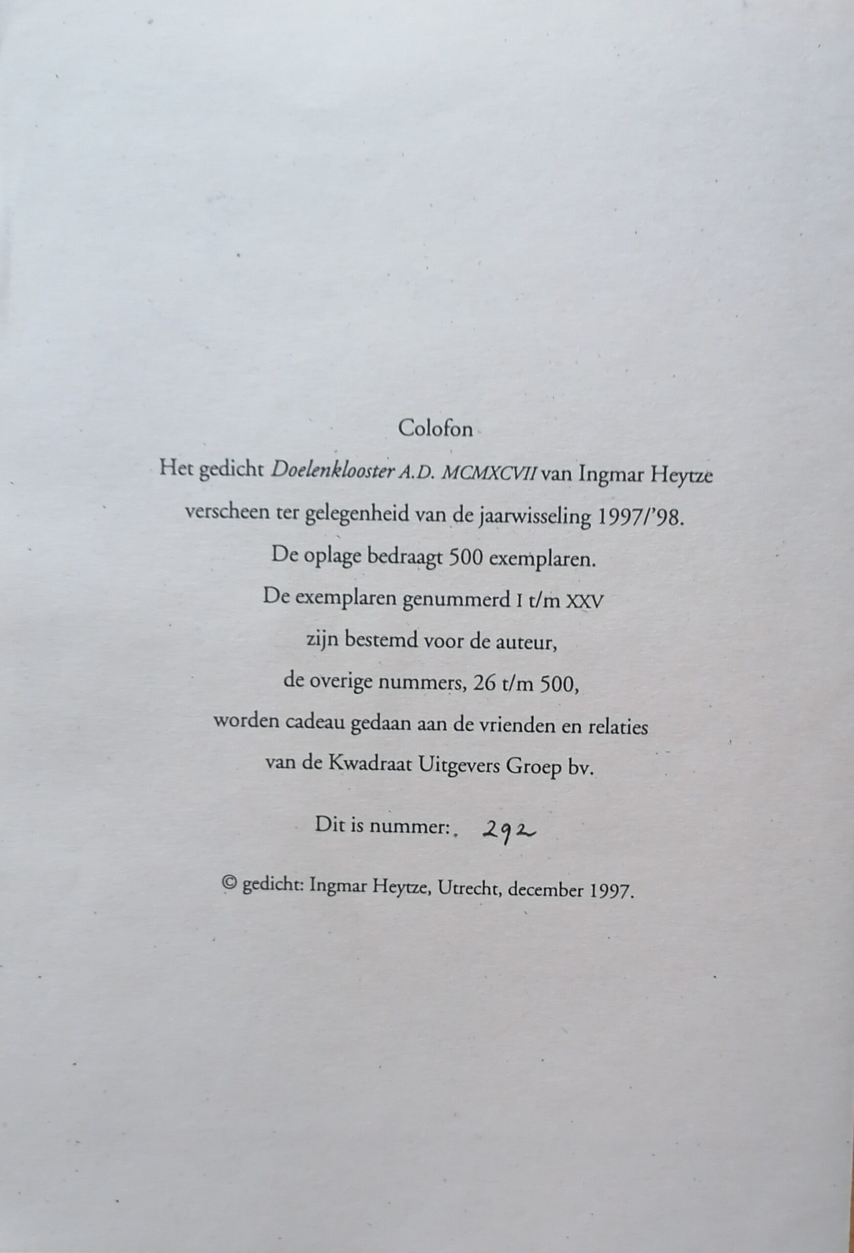 Dit gedicht verscheen ter gelegenheid van de jaarwisseling 1997/1998 in een oplage van 500 genummerde exemplaren.
