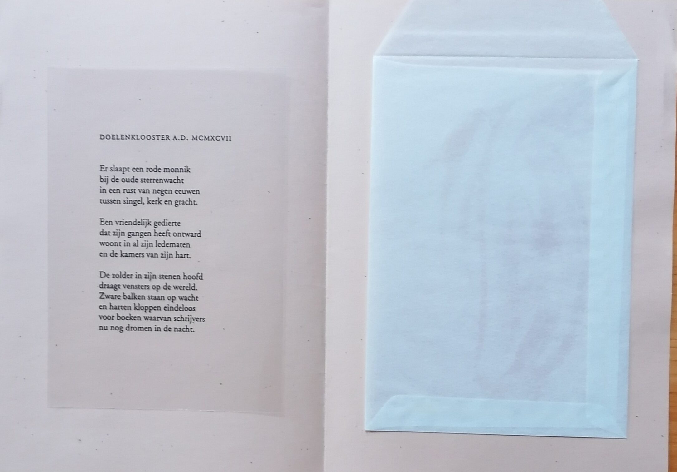 Het gedicht is op een transparante film gedrukt en is in een transparante enveloppe gestoken.