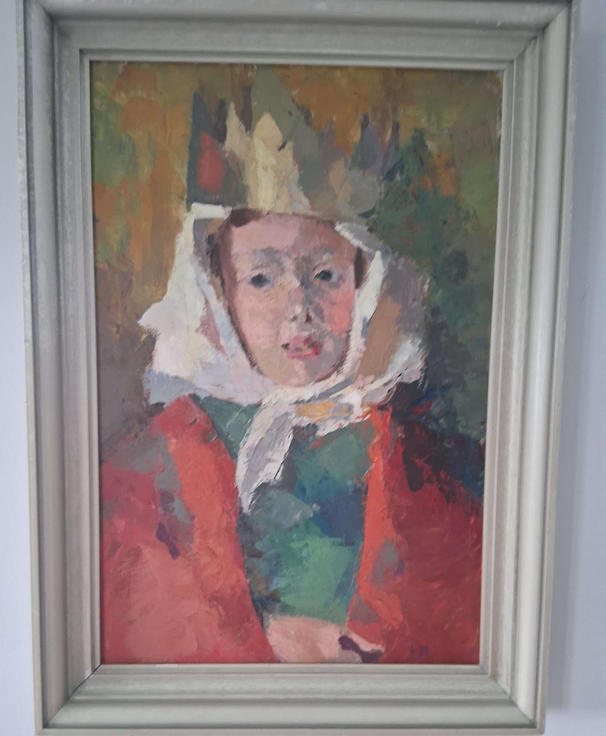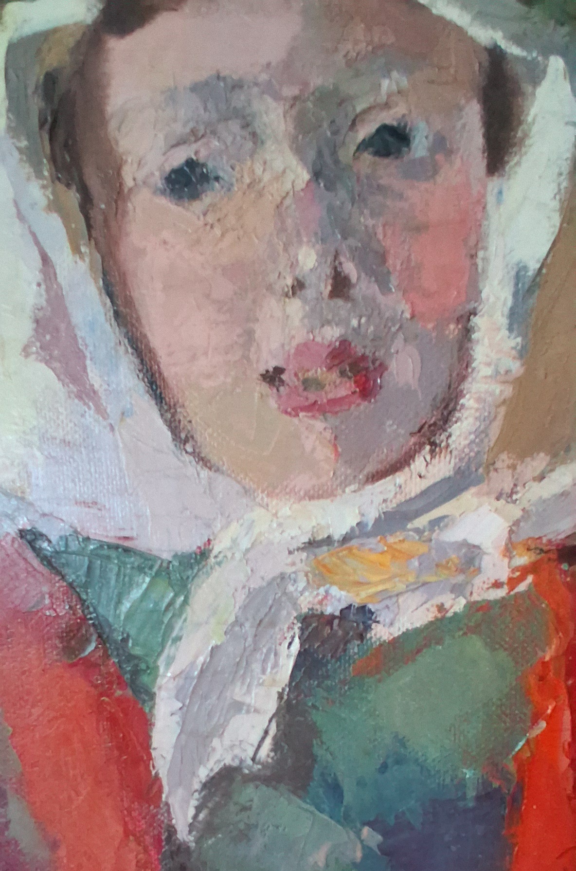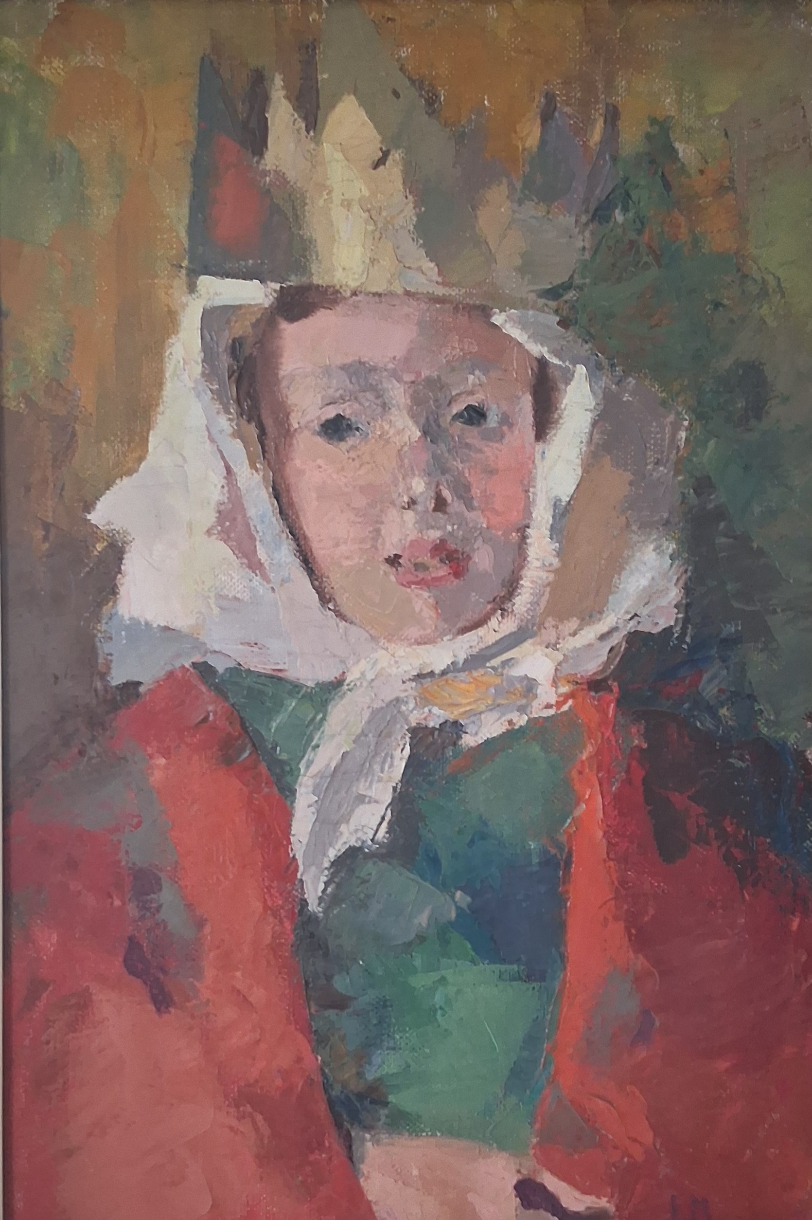 Expressief geschilderde karakterkop van een kind met feest- of carnavalskroon. Uitgevoerd in olieverf op linnen met duidelijke pasteuze toets en levendige rood-groen contrasten. Stilistisch te plaatsen binnen het modern figuratief / expressionistisch realisme van midden 20e eeuw, vermoedelijk Zuid-Nederlandse of Vlaamse academietraditie.