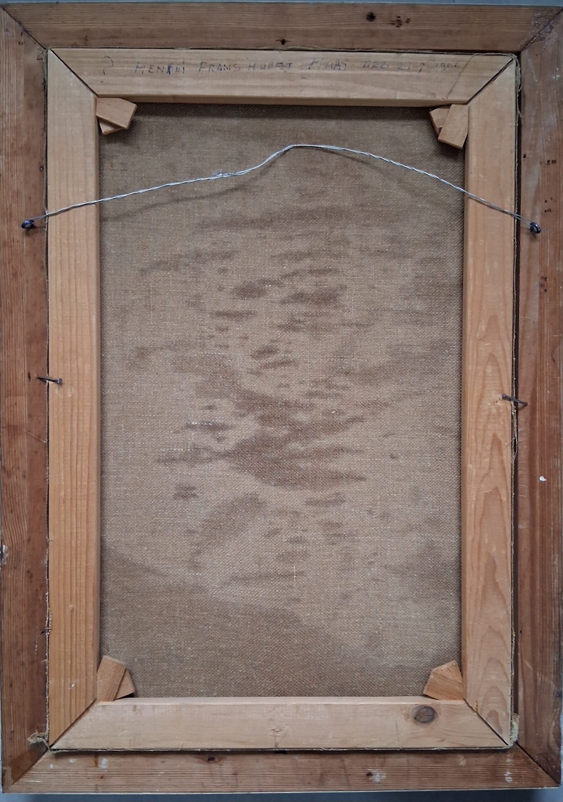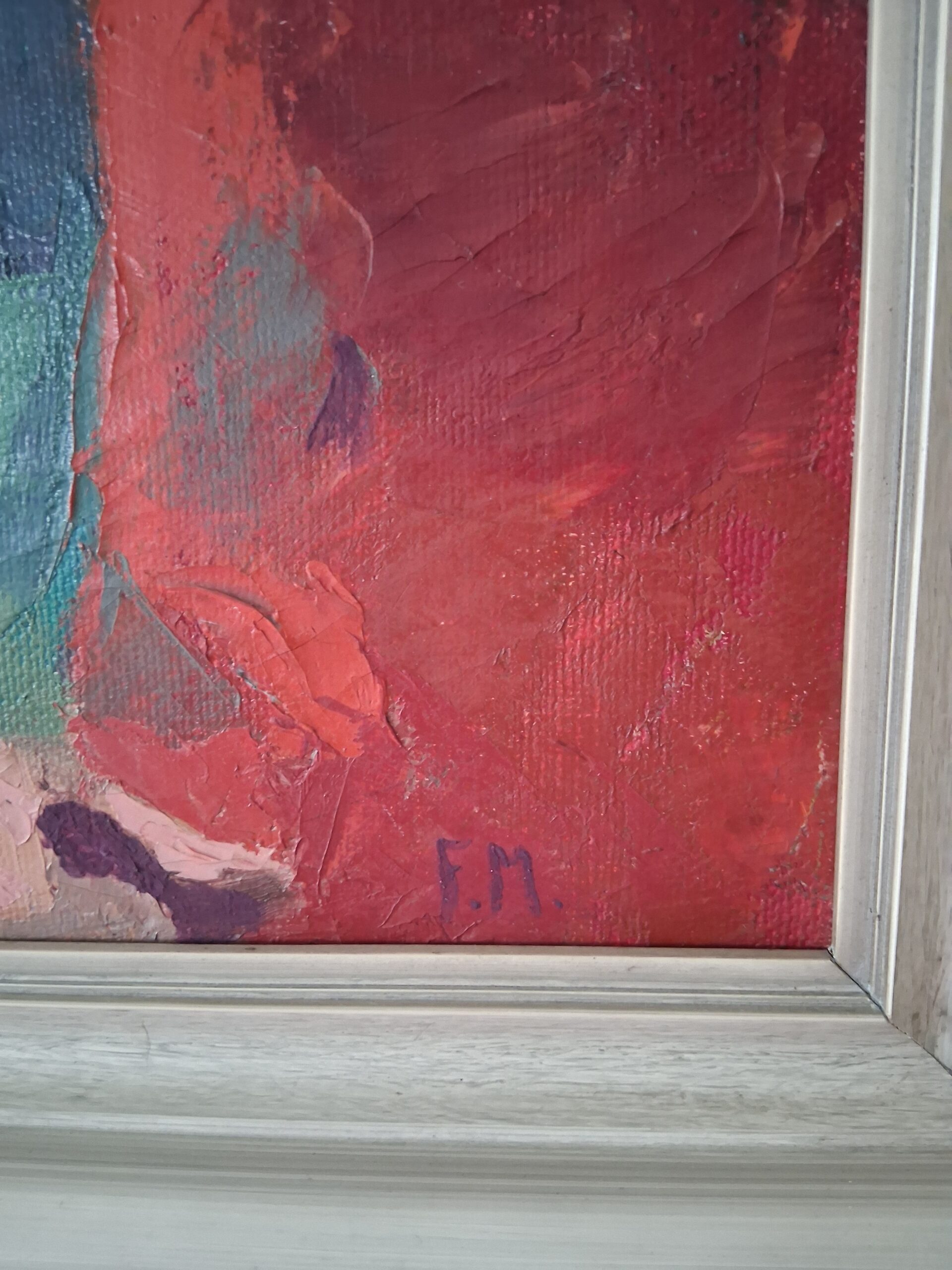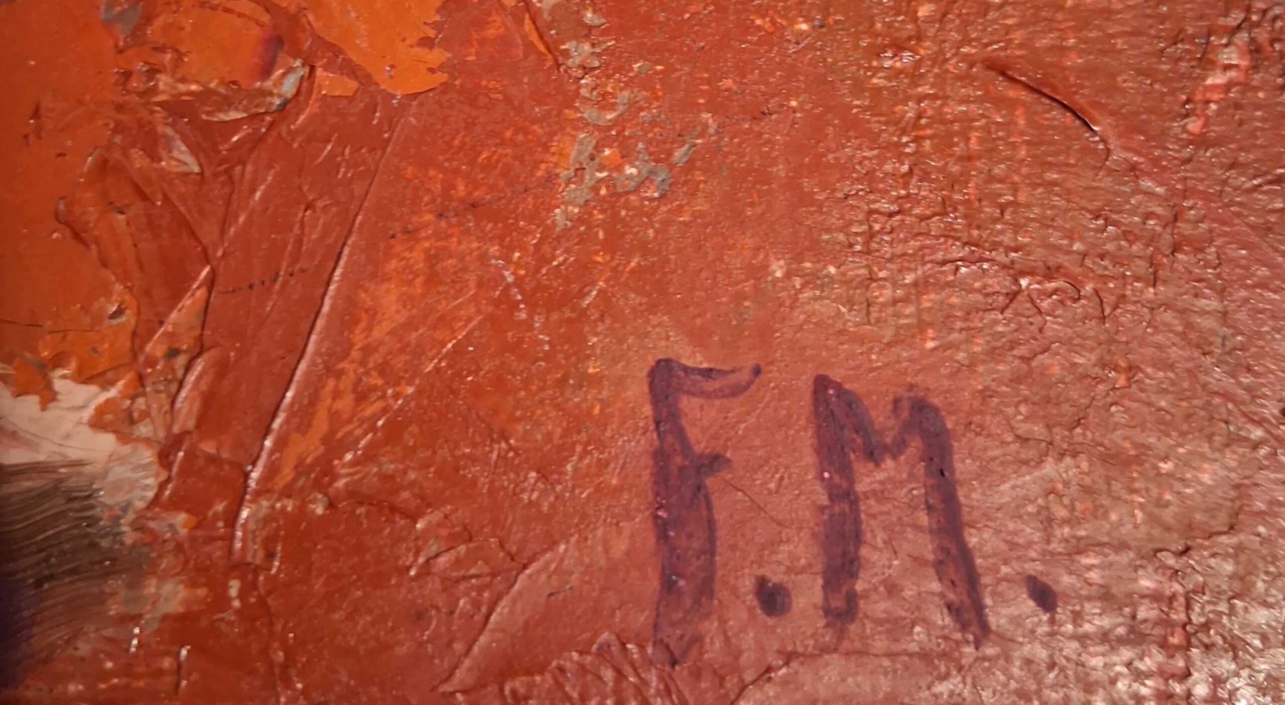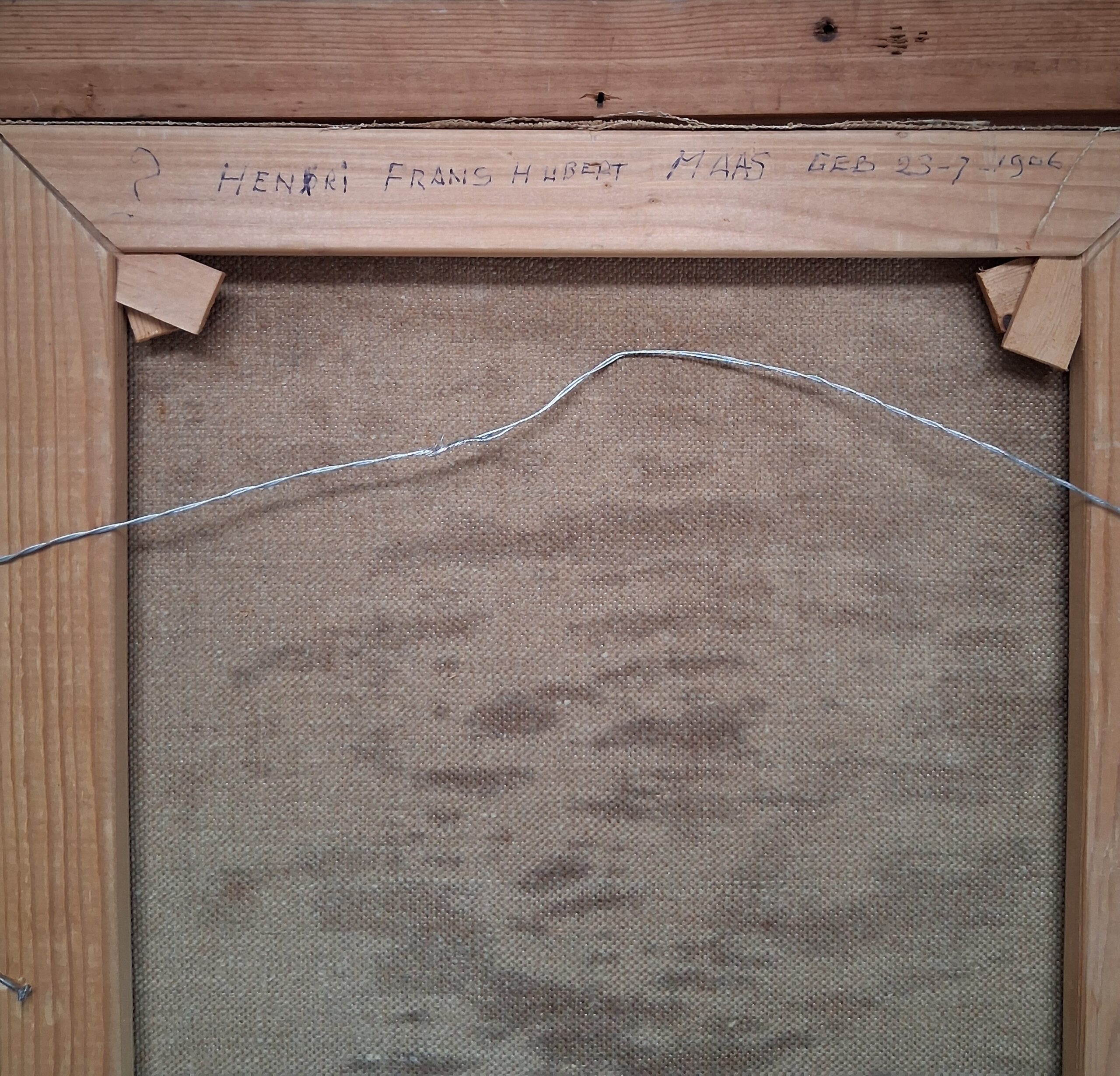 Gesigneerd rechtsonder met monogram “F.M.”. Opgespannen op spieraam. Achterzijde met latere potlood/balpen-notitie (niet leidend voor toeschrijving): ‘? Henri Frans Hubert Maas Geb 23-7-1906’
