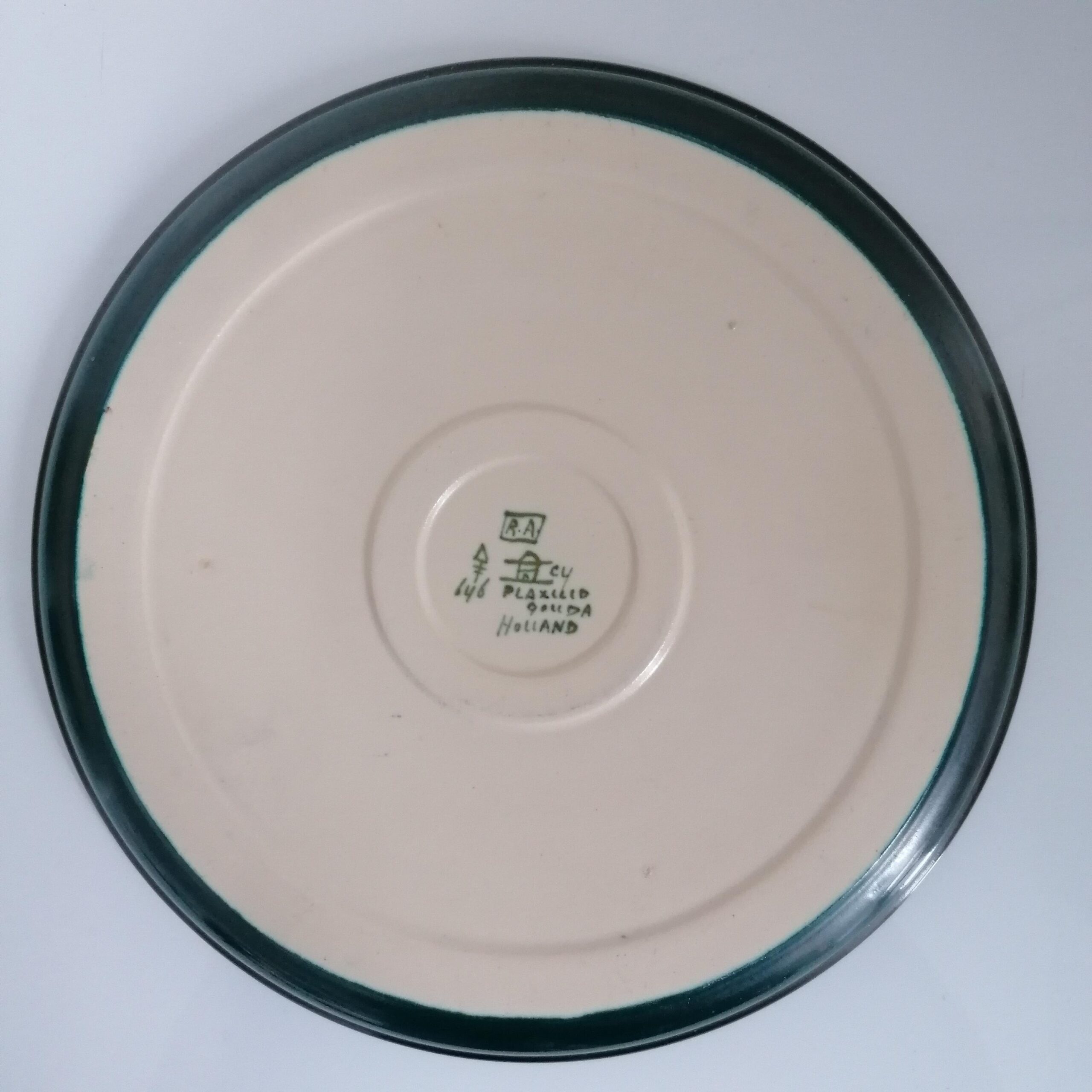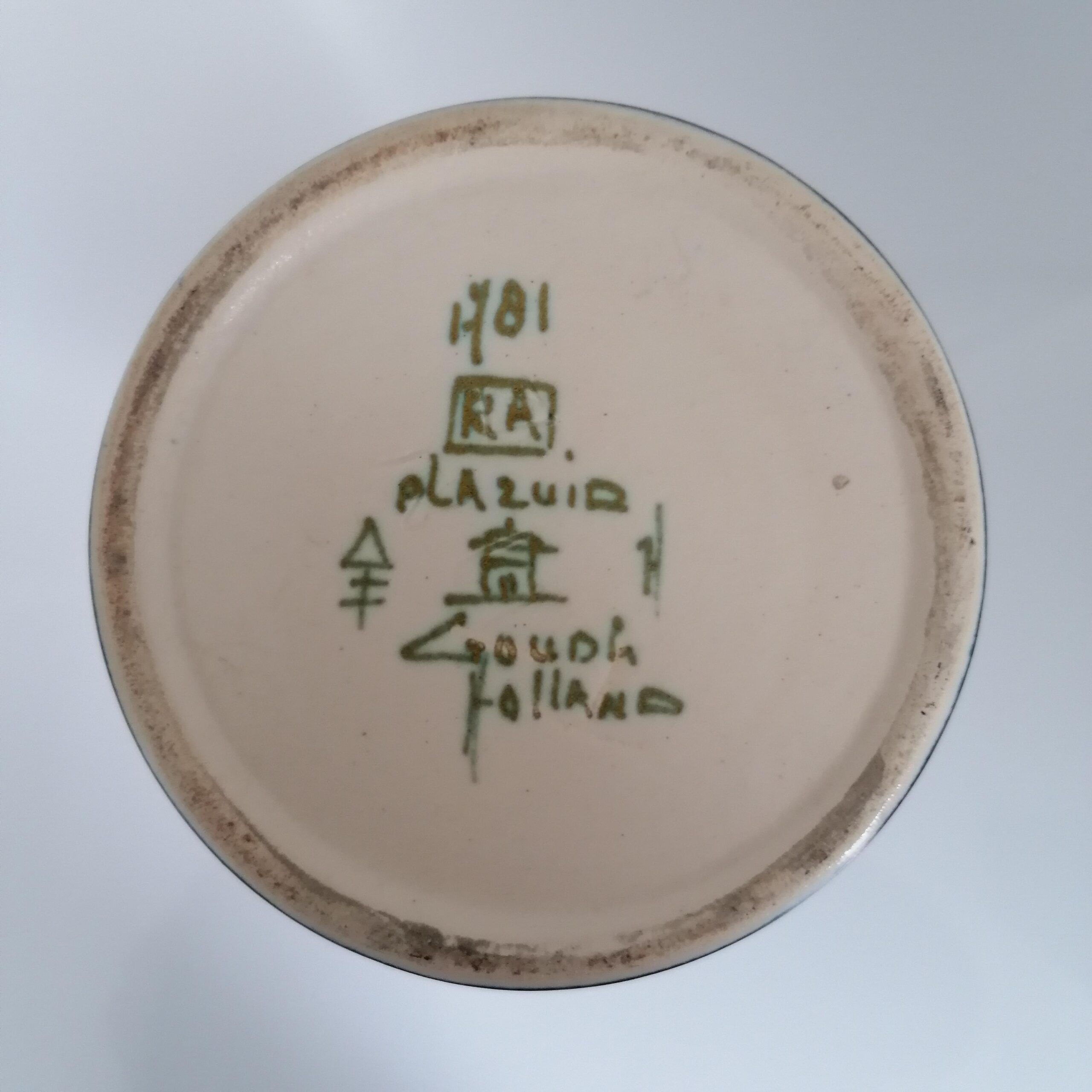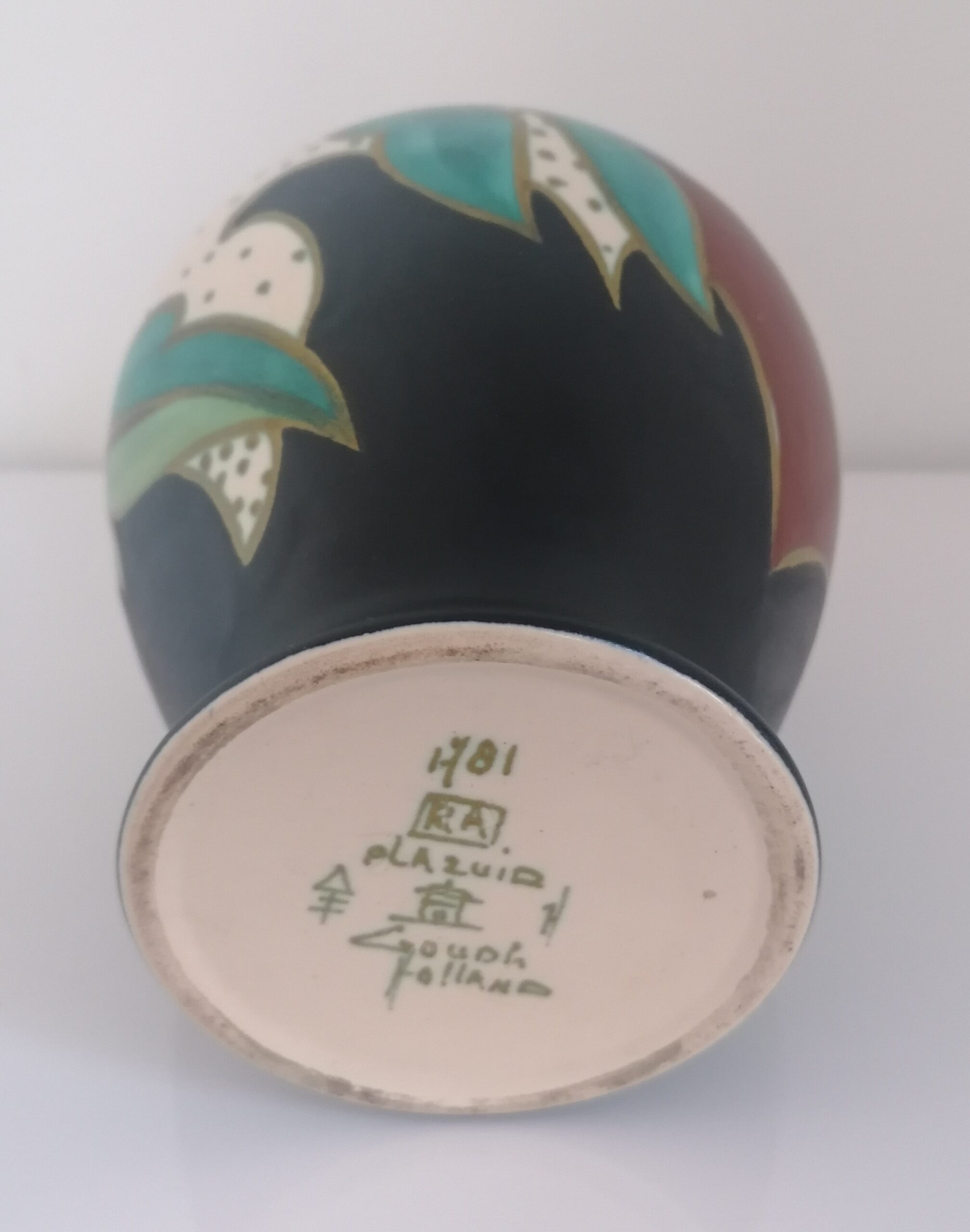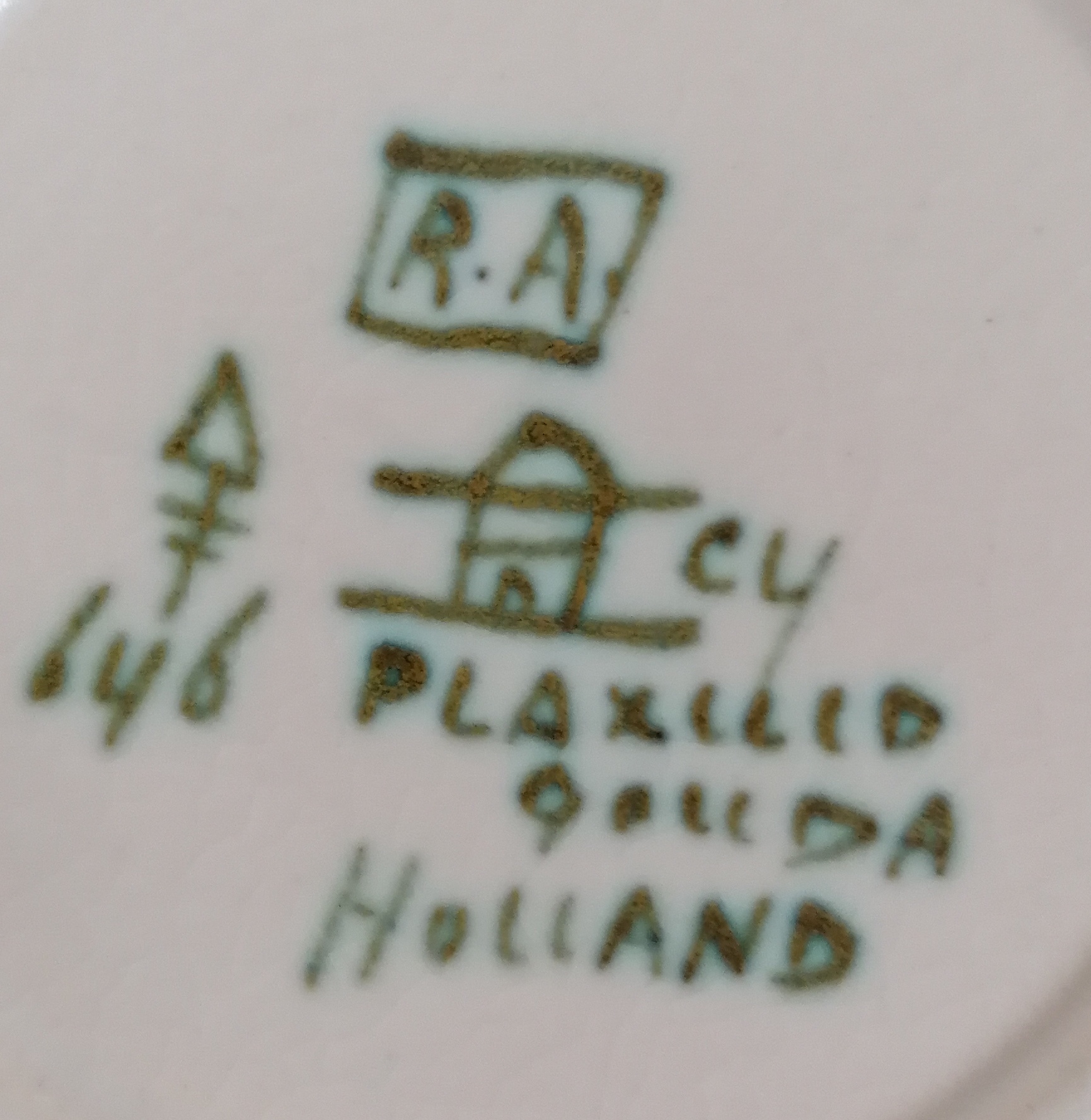 Het decor RA is minder gangbaar dan bijvoorbeeld de bekende Rhodos of Damascus decors van Plazuid. De combinatie van de matte zwarte achtergrond met de kleurrijke florale decoratie is typerend voor de vroege jaren ’30, maar komt minder vaak op de markt dan de traditionele Goudse plateelstijlen uit de jaren ’20. Dit maakt het decor interessanter voor verzamelaars die op zoek zijn naar iets bijzonders.