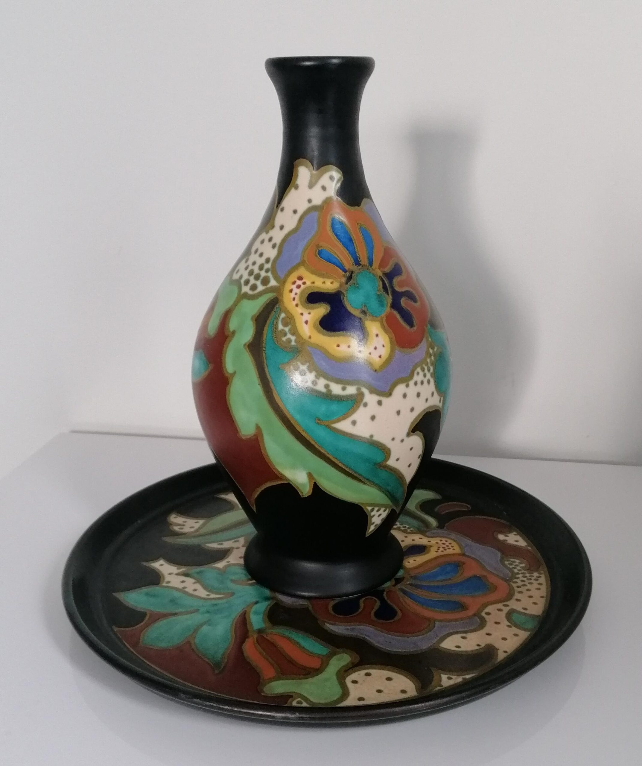 Een prachtige set. De schaal en vaas vormen samen een sterk decoratief geheel, vooral met dat matte glazuur en het expressieve decor.