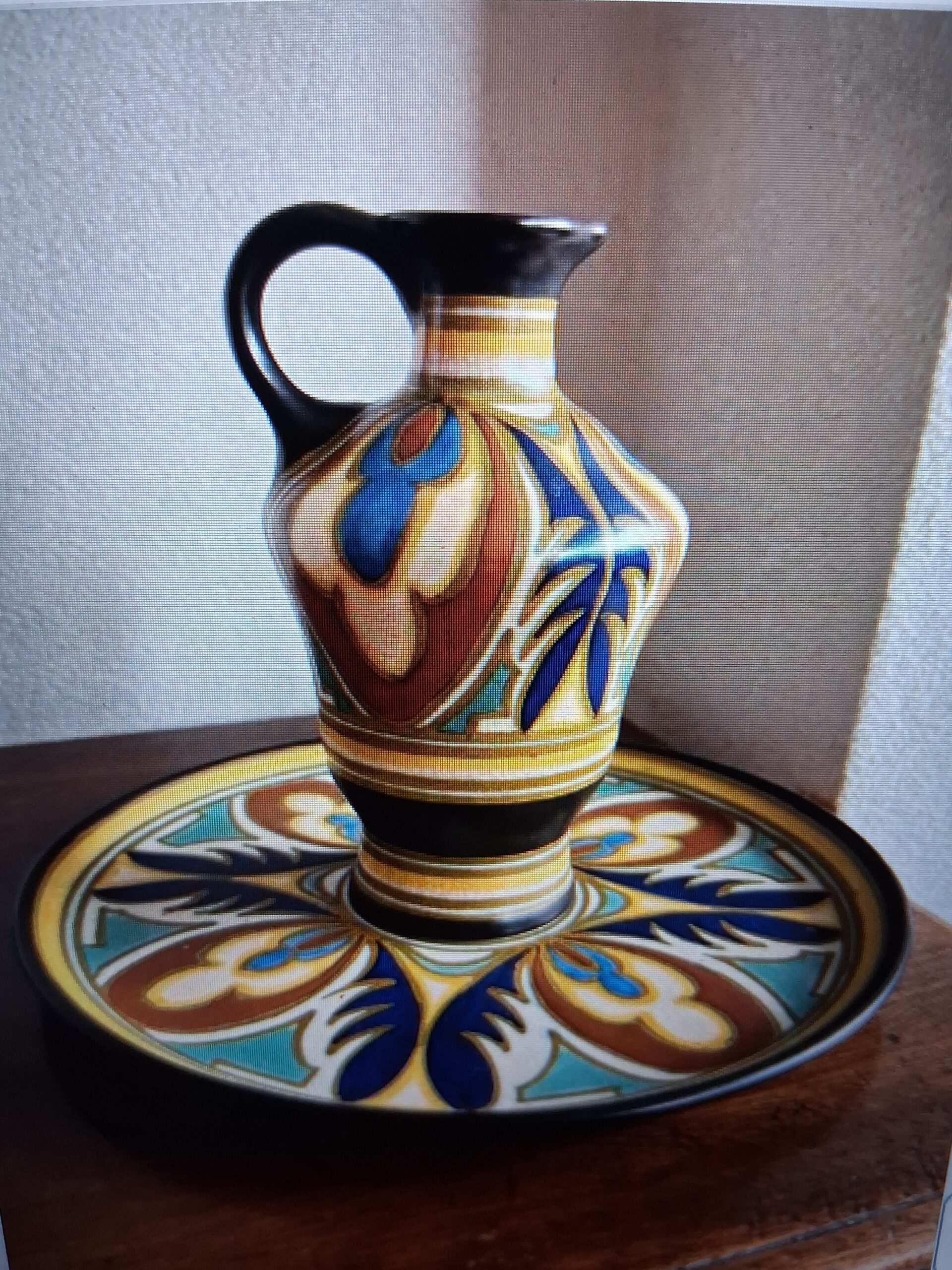 Zeldzame en gave set bestaande uit een kan en bijpassende onderschaal, beide uitgevoerd in het decor Ting, vervaardigd door Plateelfabriek Zuid-Holland (PZH), Gouda omstreeks 1930.