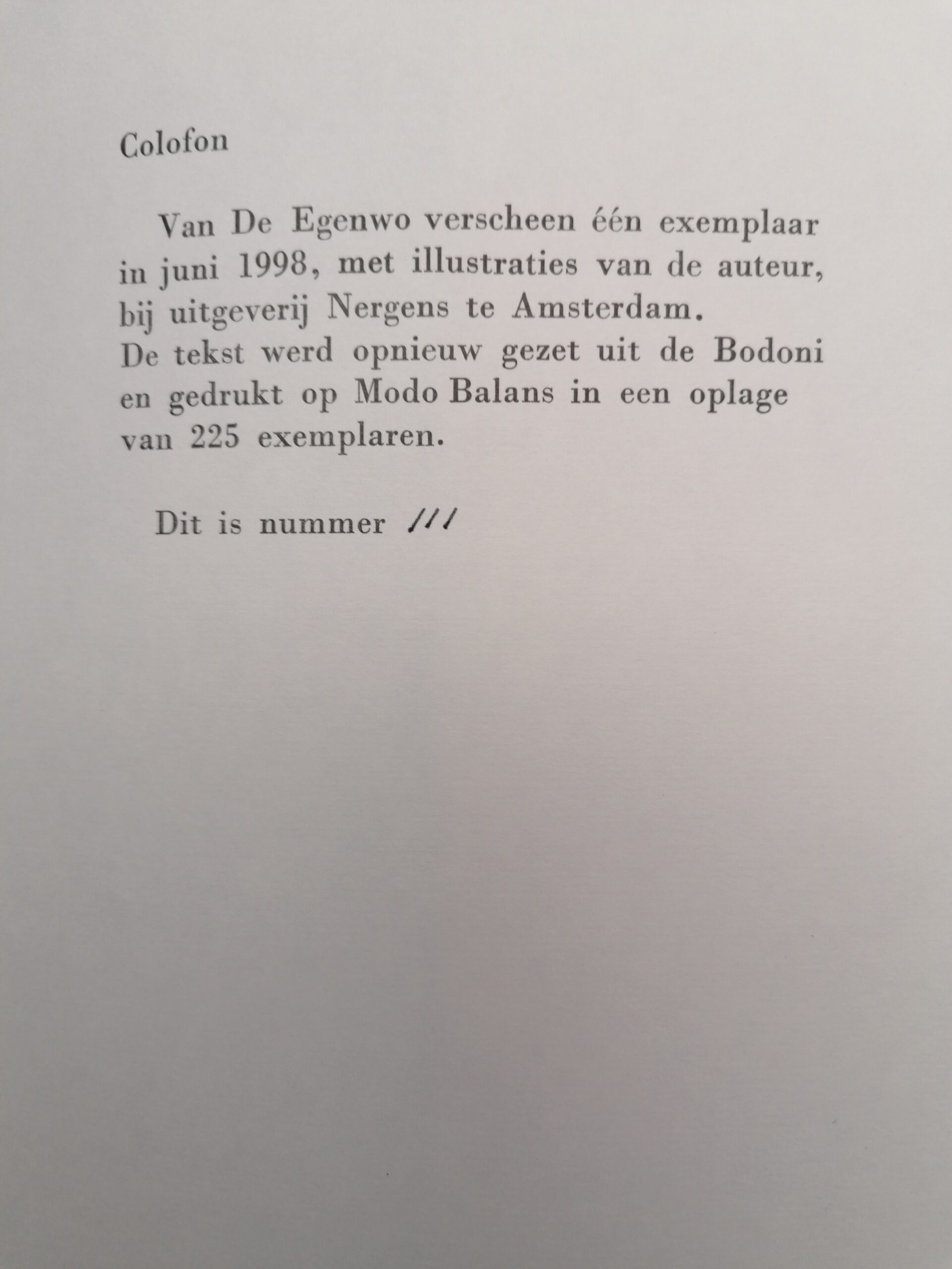 Van De Edenwo één exemplaar in Juni 1998, met illustraties van de auteur, bij uitgeverij Nergens te Amsterdam. De tekst werd opnieuw gezet uit de Bodoni en gedrukt op Modo Balans in een oplage van 225 exemplaren. Dit is nummer 111