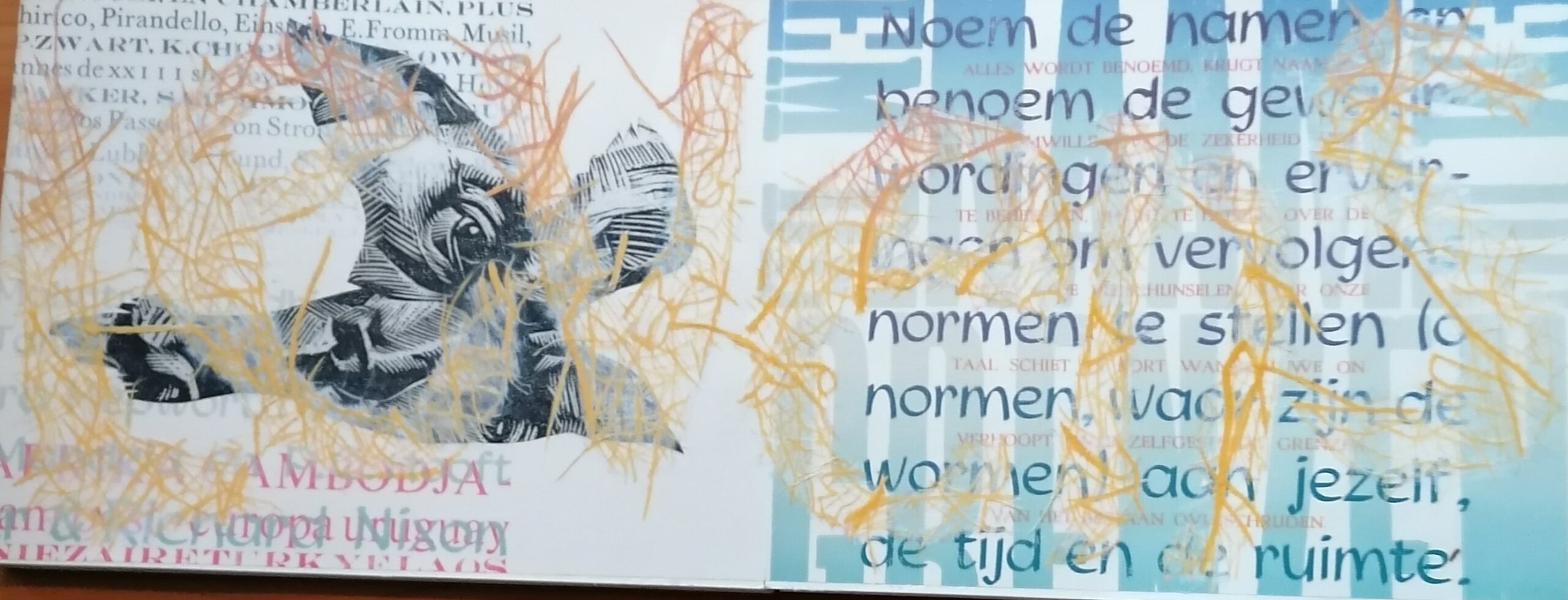 Iedere dubbele pagina heeft een thema: verwondering, lust, liefde, etc.